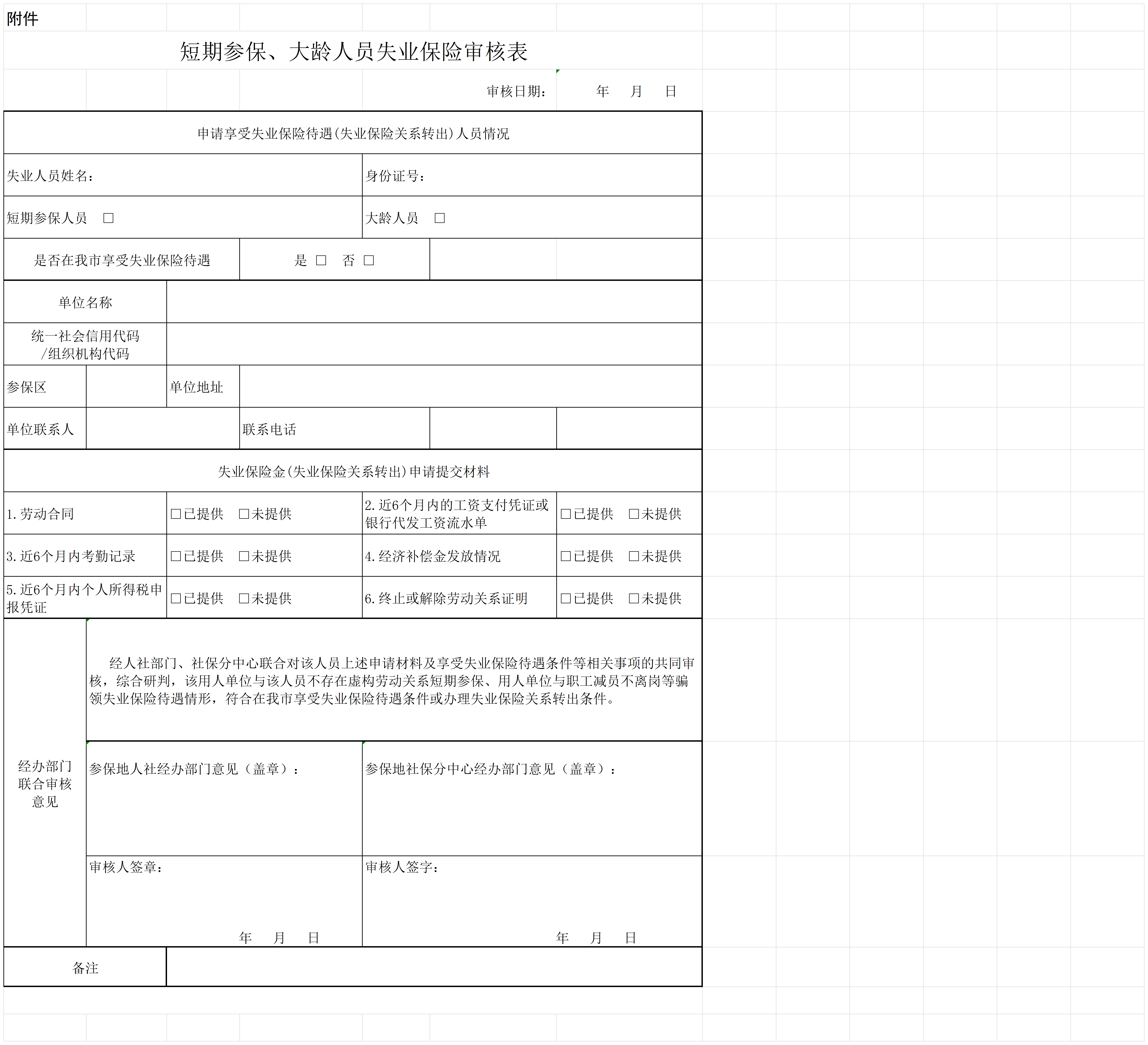 (一)强化申请核查。短期参保人员(在末次参保单位累计缴纳失业保险费6个月及以下)、大龄人员(距法定退休年龄3年及以内的)申请失业保险金核定或失业保险关系转出的,应核查劳动合同、终止或解除劳动关系证明、近6个月内的工资支付凭证或银行代发工资流水单、考勤记录、个人所得税申报凭证,需发放经济补偿金的还须核查发放凭证。用人单位提交材料齐全后,参保地人社部门、社保分中心应共同对材料进行联合审查,10个工作日内审核完毕,综合研判是否存在虚构劳动关系短期参保、用人单位与职工减员不离岗等骗领失业保险待遇情形,根据联合审查意见填写《短期参保、大龄人员失业保险审核表》。对于审核通过的,由受理的参保地人社部门或社保分中心办理失业保险金核定或失业保险关系转出手续。